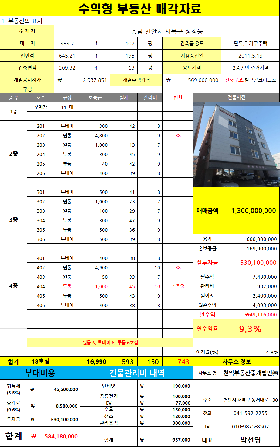 대지 353.7㎡ 107평 / 건축 209.32㎡ 63평 / 연 645.21㎡ 195평 평